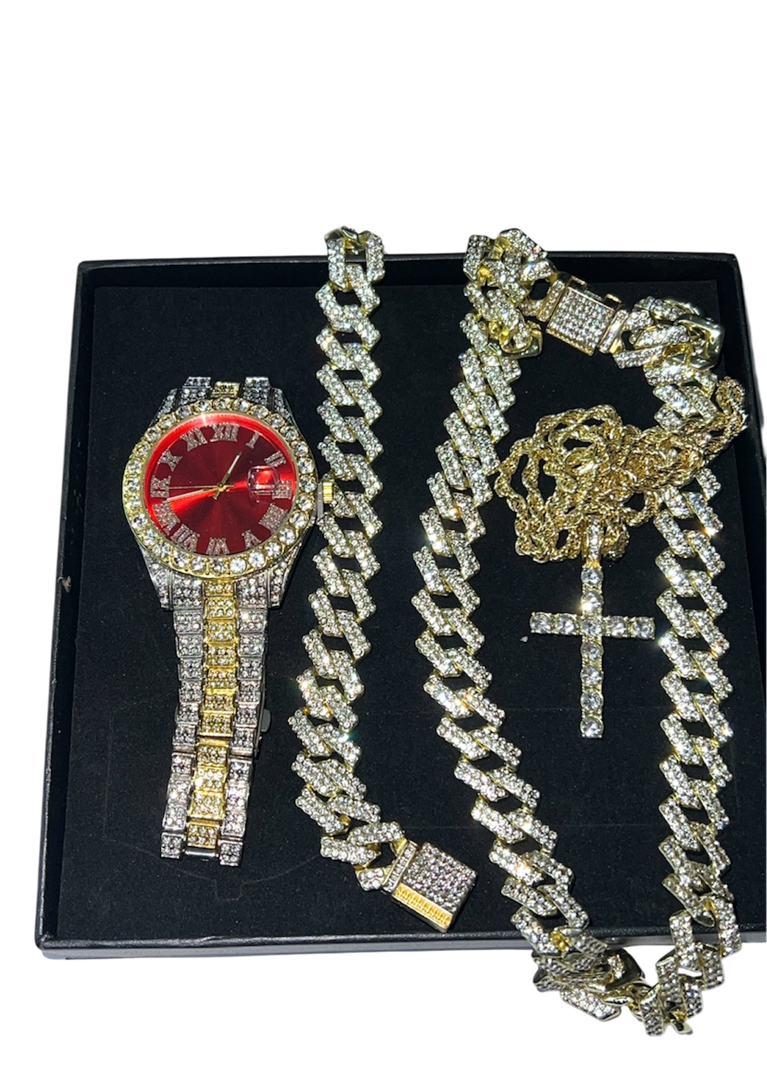 „Setul arată incredibil, exact ca în poze. Ceasul strălucește tare, brățara Cuban e solidă și se simte premium, iar lanțurile completează perfect tot look-ul. Le-am purtat împreună la un eveniment și am primit multe complimente. Raport calitate-preț foarte bun pentru câte piese primești.” – Adrian A.